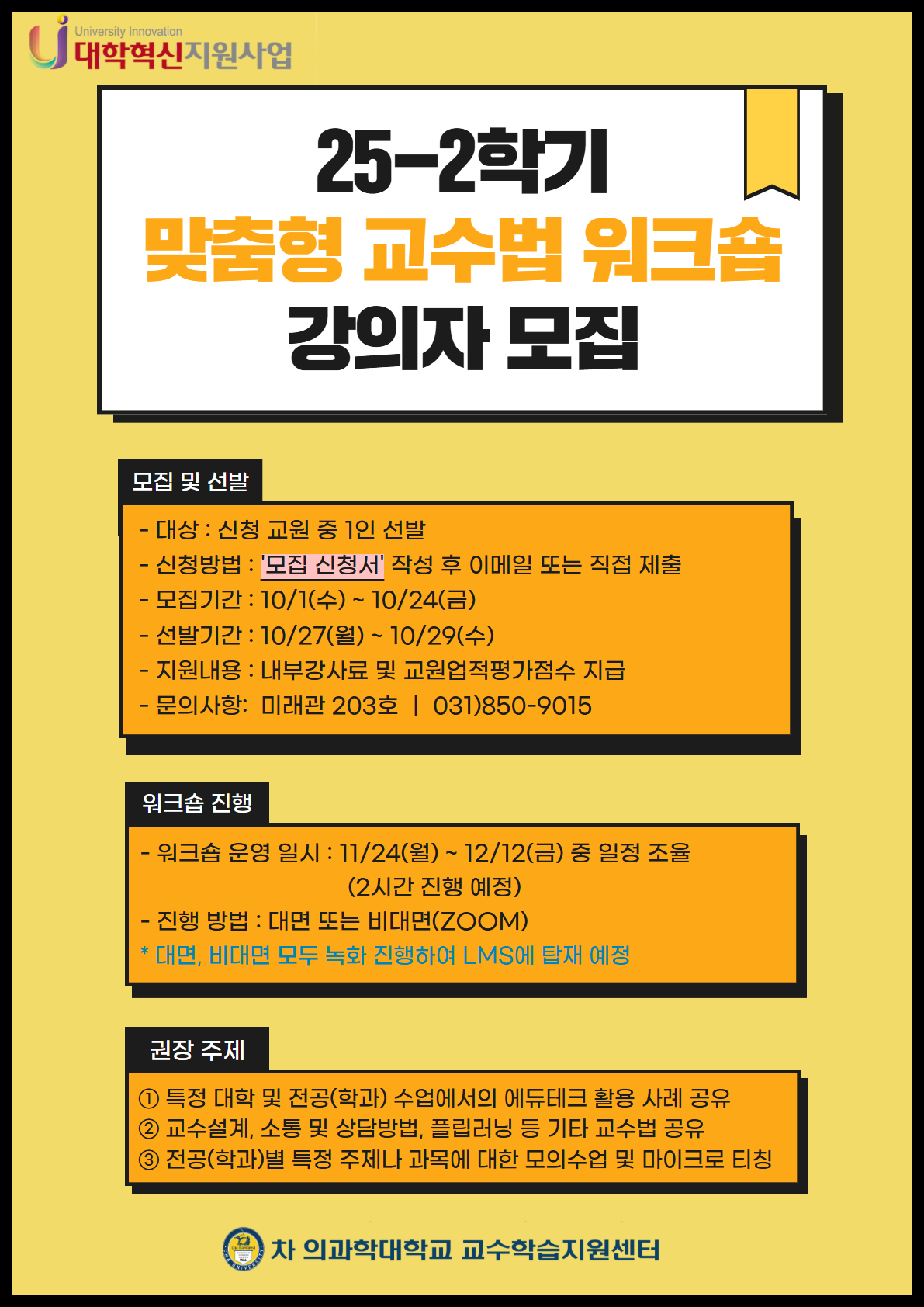 [교수학습지원센터] 25-2학기 맞춤형 교수법 워크숍 강의자 모집 안내